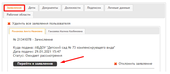 В личном кабинете выбрать вкладку «Заявления». Затем нажать кнопку «Перейти к заявлению».