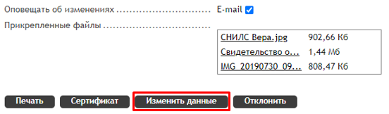 После перехода к заявлению необходимо нажать на кнопку «Изменить данные».