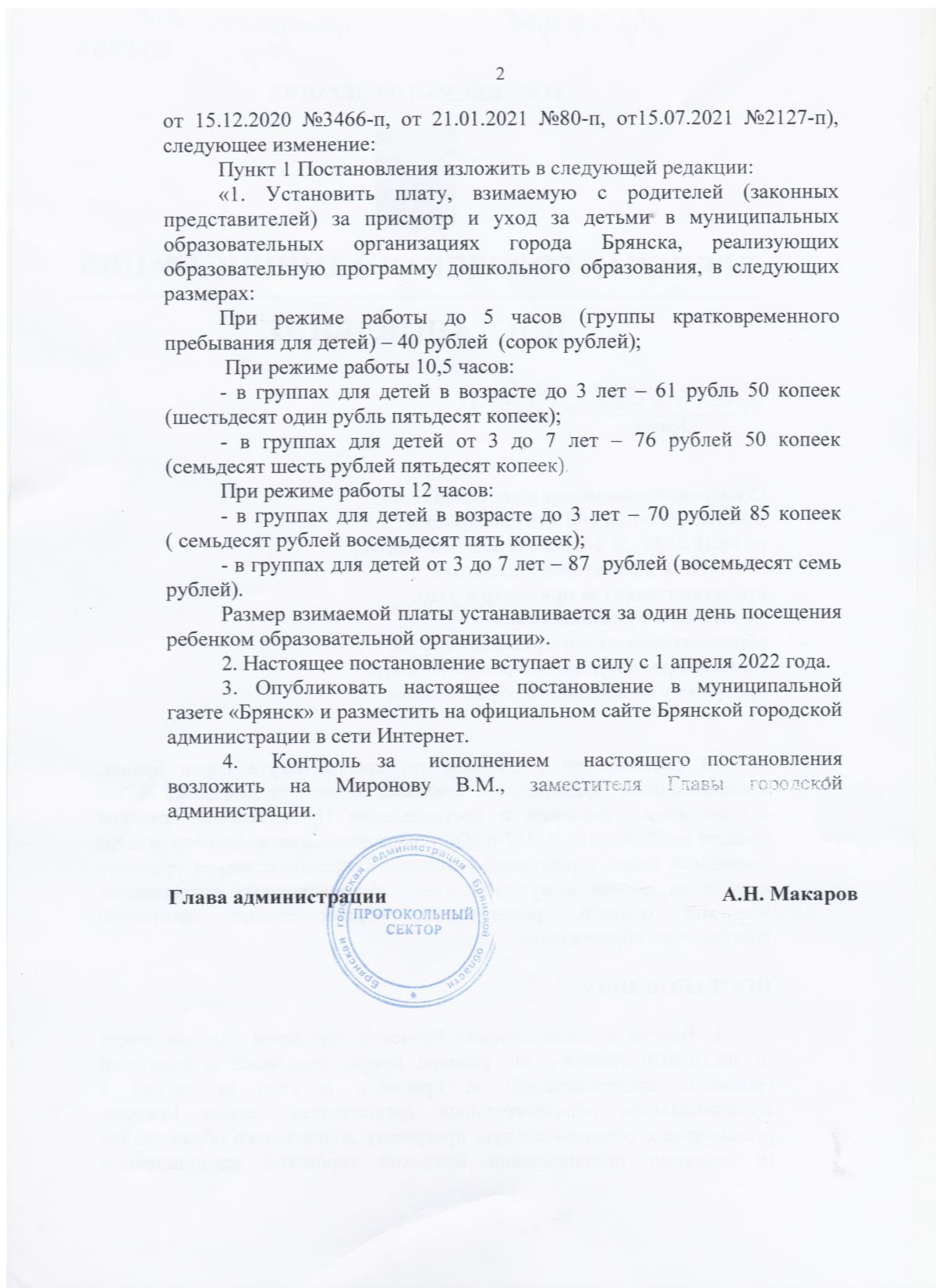 Постановление "О внесении изменения в постановление Брянской городской администрации от 08.10.2020 №2648 «О размере платы, взымаемой с родителей (законных представителей) за присмотр и уход за детьми в муниципальных образовательных организациях города Брянска, реализующих образовательную программу дошкольного образования»"