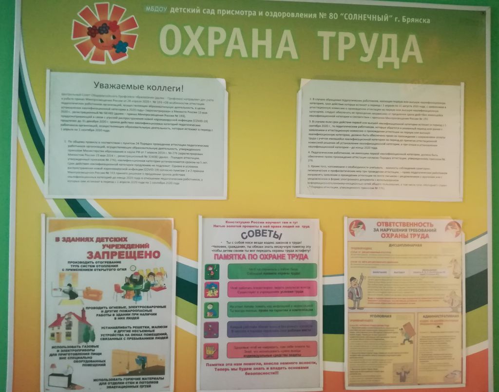 Охрана труда в МБДОУ детском саду №80 «Солнечный» г. Брянска представляет собой систему сохранения жизни и здоровья работников в процессе трудовой деятельности, включающей нормативно-правовые, социально-экономические, организационно-технические, санитарно-гигиенические, лечебно-профилактические и другие мероприятия.