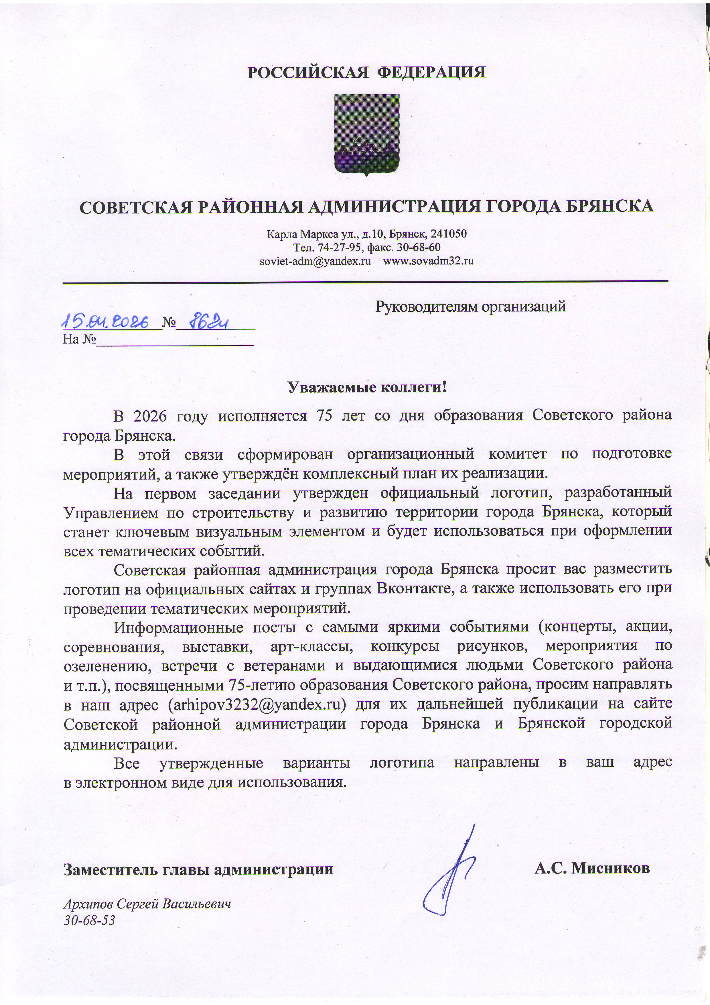 В 2026 году исполняется 75 лет со дня образования Советского района города Брянска. Управлением по строительству и развитию территории города Брянска разработан логотип, посвященный этой дате.